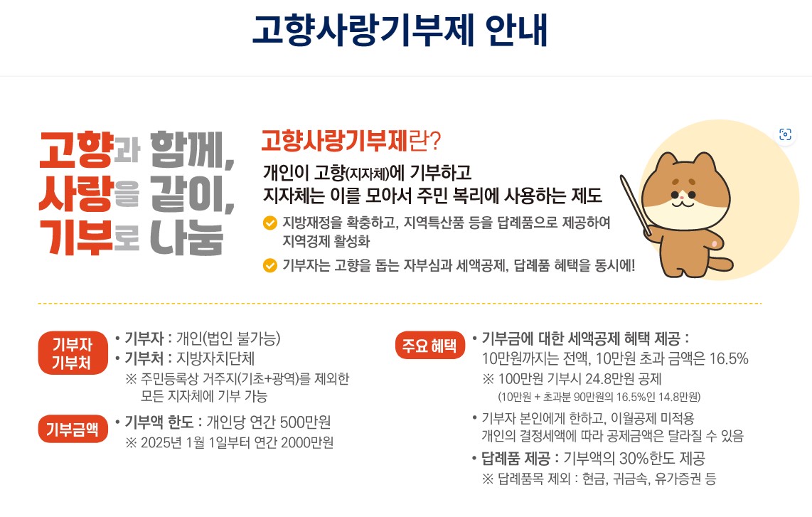 고향사랑 기부제는 2023년부터 시행된 제도로, 기부자가 거주지 외의 지역에 기부를 통해 지역 발전에 기여할 수 있는 제도입니다. 기부자는 기부한 금액에 대해 10만 원까지는 전액세액 공제 혜택을 받을 수 있고, 각 지역에서는 이를 통해 지역 사회를 위한 다양한 사업을 추진할 수 있습니다.