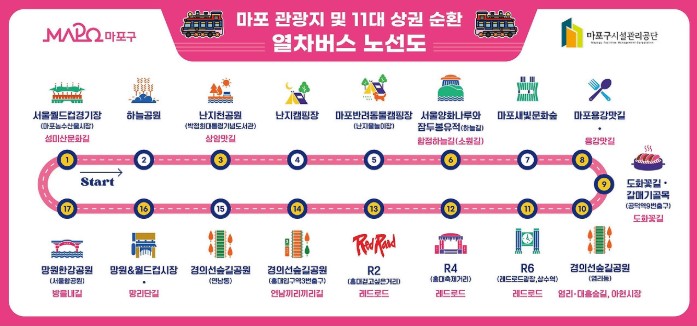 서울 마포구에서는 11대 상권과 17개 주요 관광 명소를 순환하며 연결하는 도심형 시티투어버스, 마포순환열차버스를 운영 중입니다.