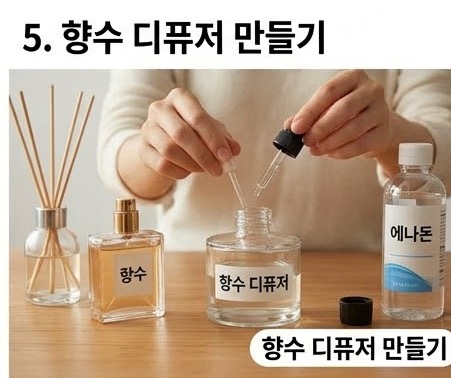 * 디퓨저 만들기: 남은 향수를 소독용 에탄올과 3:7 비율로 섞어 유리병에 담고 우드 스틱을 꽂으면 근사한 디퓨저가 완성됩니다.